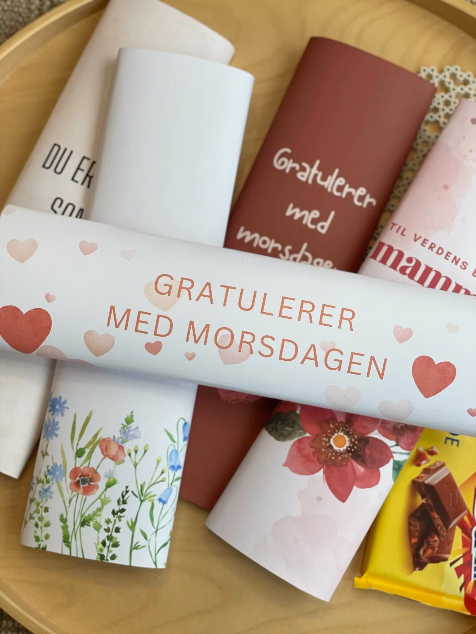 Fem ulike omslag som passer til morsdagen - inkludert et omslag som kan passe til enhver anledning (Du er søt som sjokolade). Omslagene lastes ned og printes ut enkelt med vanlig printer på vanlig A4-papir, brettes og tapes så rundt favorittsjokoladen.