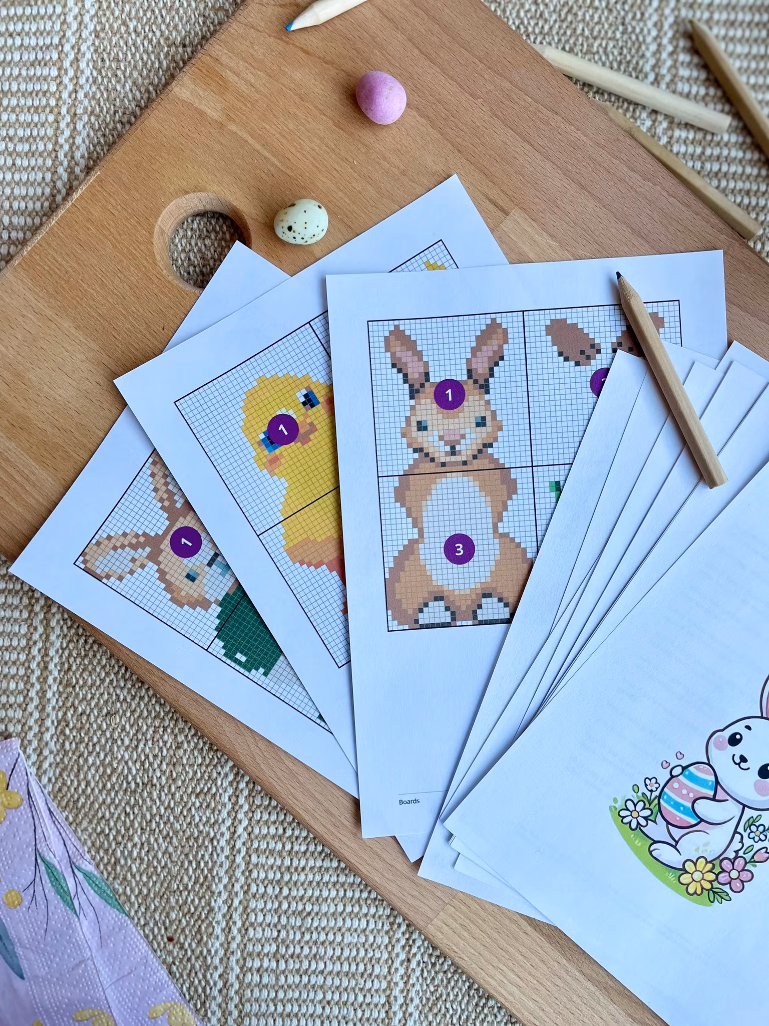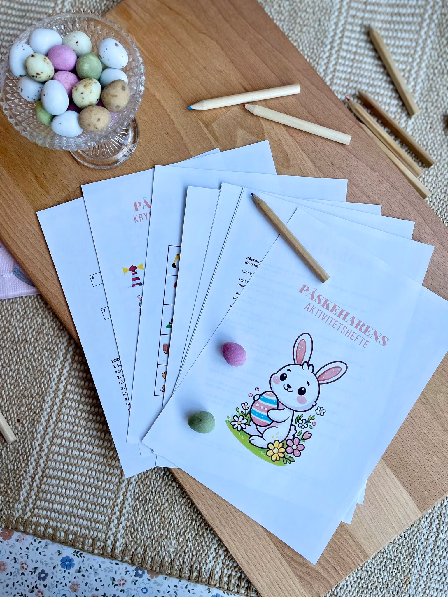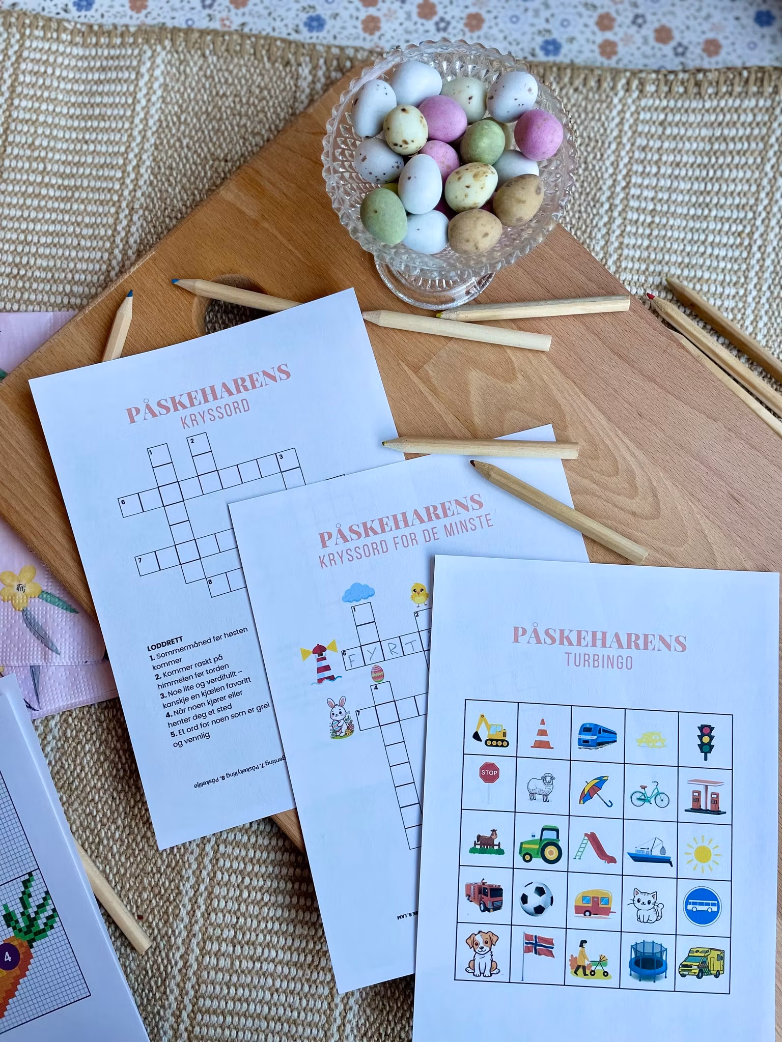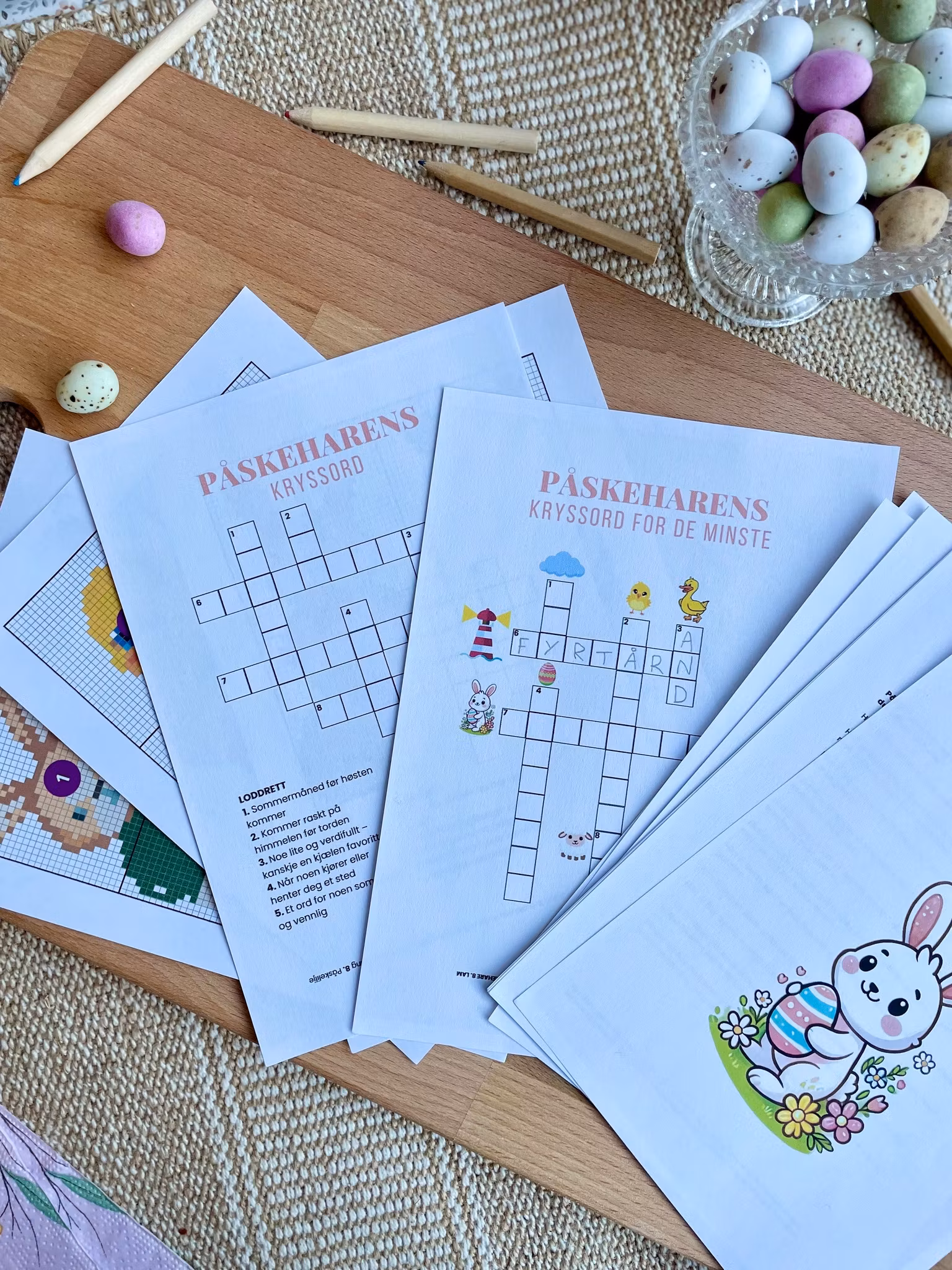 Påskeharen har laget et aktivitetshefte som passer for alle små: bingo, adjektivfortellinger, kryssord, rebus, perlemønstre, en sjekkliste med ulike aktiviteter man kan gjøre i påsken og flere ark med fargelegging. Totalt er heftet på 15 sider - også kommer det 4 perlemønstre i tillegg til dette. Du velger selv hva du ønsker å printe. Har du flere barn kan du printe flere eksemplarer av det du ønsker.