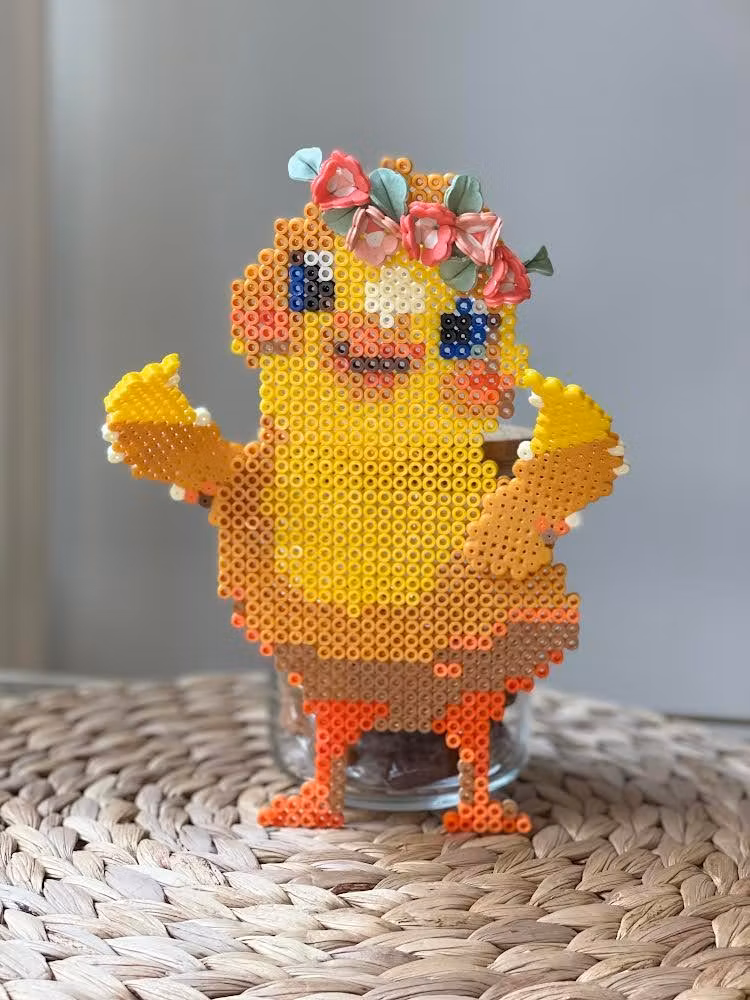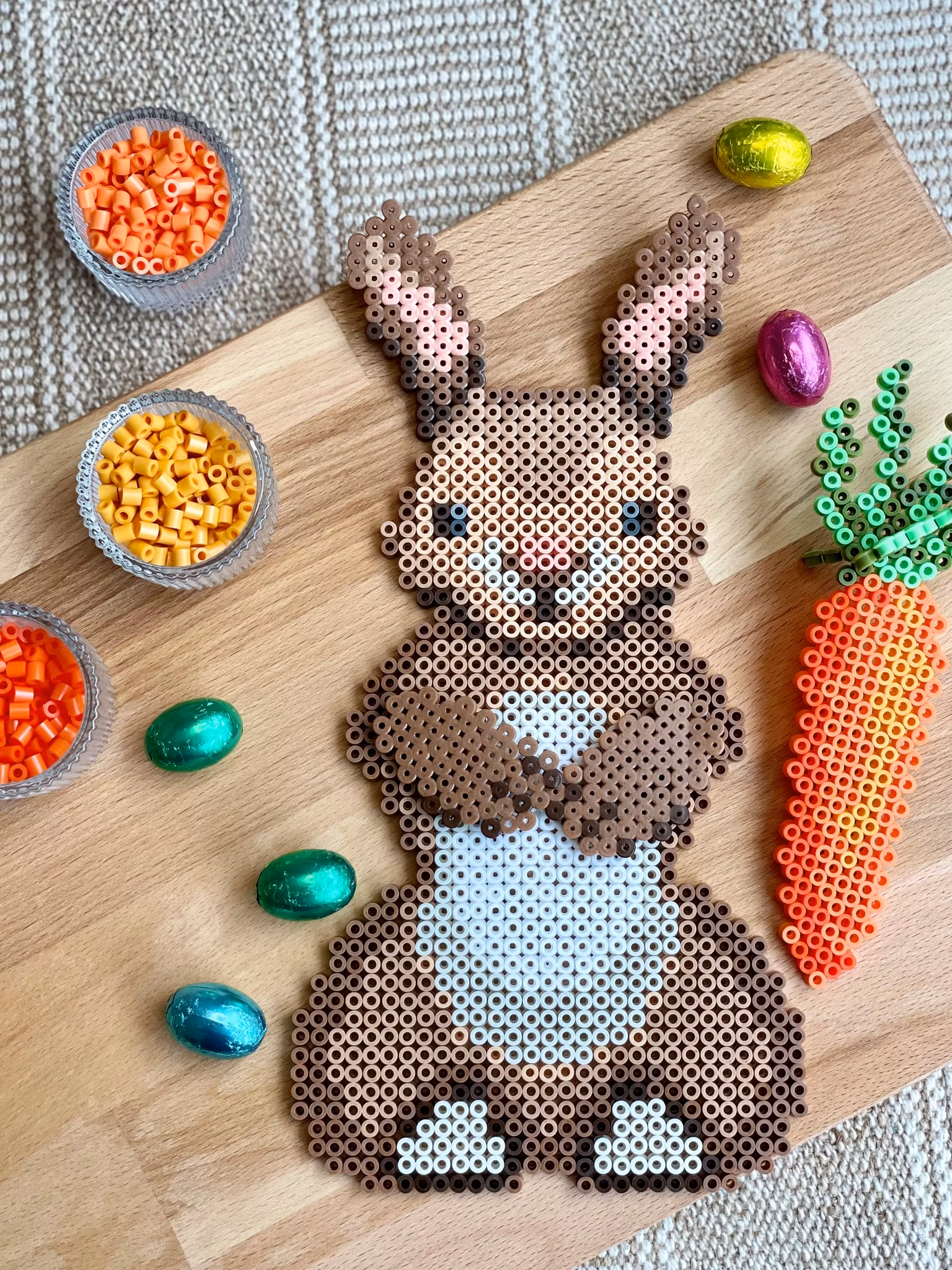 Mønster med hare og egg: Det perlede påskeegget er perlet på et perlebrett formet som ett egg - så da trenger du dette perlebrettet for å perle egget. Se på bildet av egget for å se hvordan jeg har valgt å perle det.